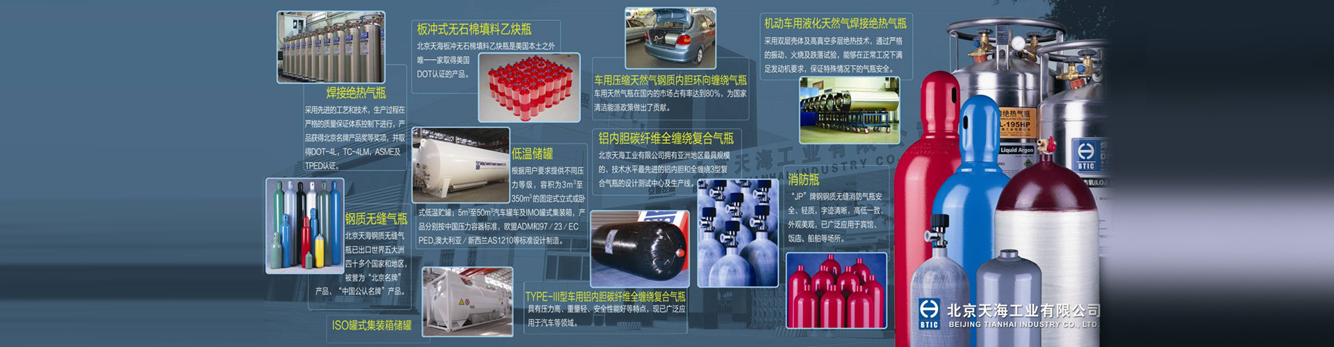 华体会手机网页版(以下简称“天海工业”)是北京京城机电控股有限责任公司所属北京京城机电股份有限公司(简称京城股份,H股证券代码00187,A股证券代码600860)主要骨干企业,是拥有七个专业气体储运装备生产基地(天海氢能、上海天海、天津天海、宽城天海、明晖天海、天海低温、江苏天海)及一个美国公司的集团公司。天海工业及下属子公司具有A2级高压容器、B1级无缝气瓶、B2级焊接气瓶、B3级纤维缠绕气瓶、B4级低温绝热气瓶、B5级溶解乙炔气瓶、C2级罐式集装箱、D级中低压容器的设计和生产资质。可生产800余个品种规格的钢质无缝气瓶、玻璃纤维环向缠绕气瓶、碳纤维全缠绕复合气瓶(含三型瓶、四型瓶、呼吸器)、无石棉填料乙炔瓶、焊接气瓶、焊接绝热气瓶(含车用)、固定式压力容器、低温罐式集装箱、船用罐、CNG/LNG/H2车载供气系统及加气站等系列产品,广泛应用于汽车、化工、消防、医疗、石油、能源、城建、食品、冶金、机械、电子等行业。